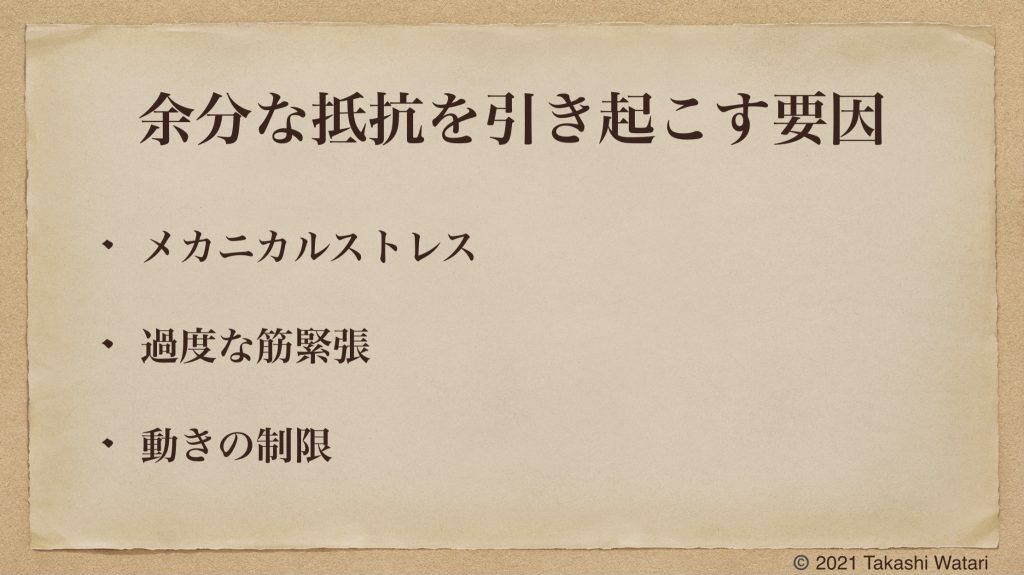本日のブログでは、余分な抵抗について紹介しました。私は余分な抵抗を引き起こす要因について、メカニカルストレス・過度な筋緊張・動きの制限の3つに大別して認識しています。これらの中で、私は動きの制限を認識する事を重要視しています。なぜなら動きの制限は、先程紹介したメカニカルストレスや過度な筋緊張を引き起こす要因になる事が多いからです。私がどの様にして動きの制限がある部位を認識しているのか、少し先のブログで書く予定です。