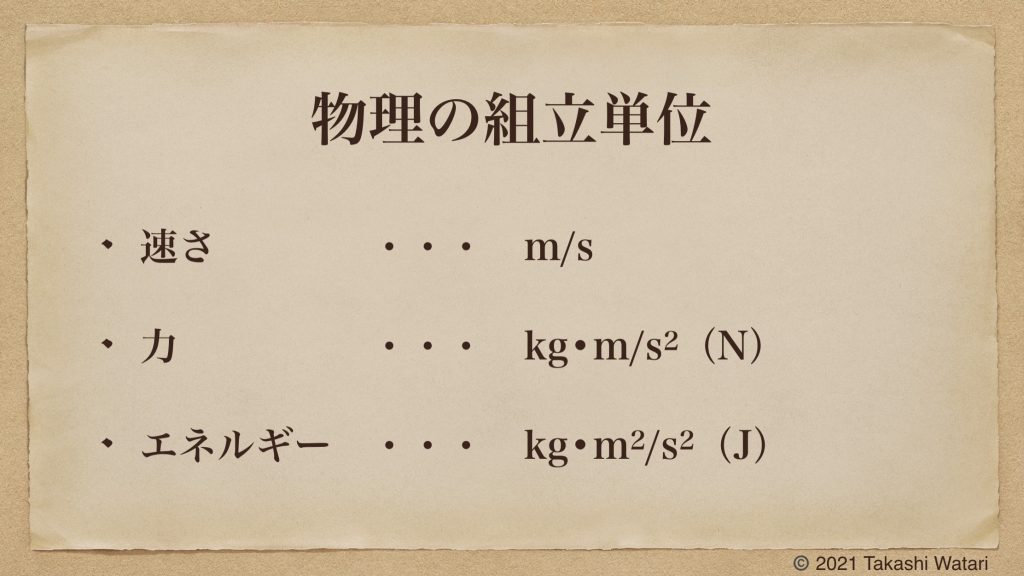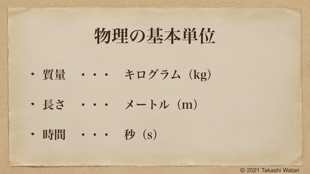 質量・長さ・時間、これは、物理の基本単位と呼ばれるものです。他にもいくつかありますが、このブログではこの3つだけを紹介します。これら基本単位の組合せにより、速さや力やエネルギーなど、様々な概念を示す事が可能になります。基本単位の組合せにより示された単位の事を組立単位と呼びます。
