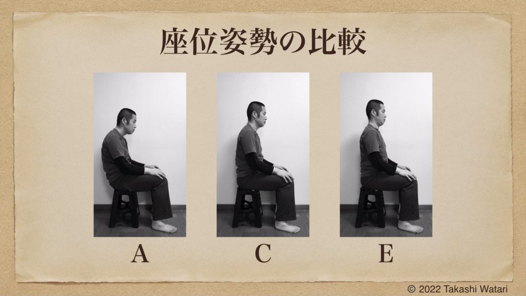Eの姿勢では、文字通り「背すじを伸ばす」事に意識が向いています。結果として、背部の過度な筋活動が生じています。その一方で、Cの姿勢では、腹部深層を含む「身体の芯」を使う事に意識が向いています。その結果、自然と背すじが伸びています。自然と背すじが伸びているのか、意識的に背すじを伸ばそうとしているのか、これがCの姿勢とEの姿勢の大きな違いです。