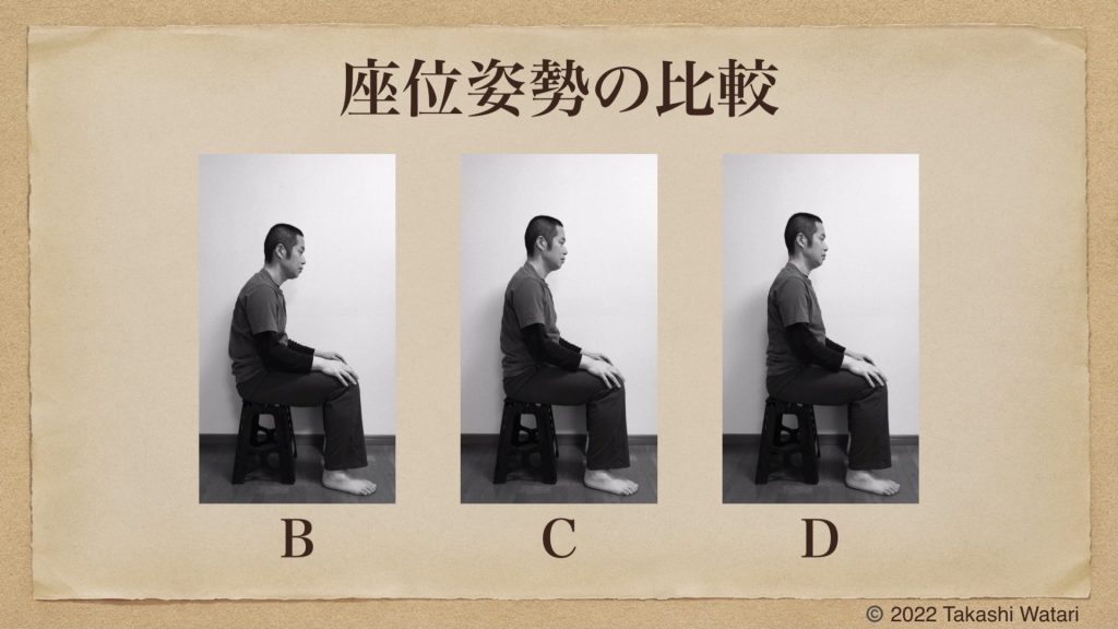 この図の中で、最も背すじを伸ばした姿勢とは、右端のDにあたるでしょう。とはいえ、日常生活において背すじを伸ばす際には必ずしもDの姿勢をとる必要はない、と私は考えます。前回のブログで述べましたが、Bの姿勢は下を、Dの姿勢は上を向く事に適した姿勢です。日常生活においていわゆる「背すじを伸ばした姿勢」をとる際には、中央のCの姿勢がとれれば十分であると私は考えます。