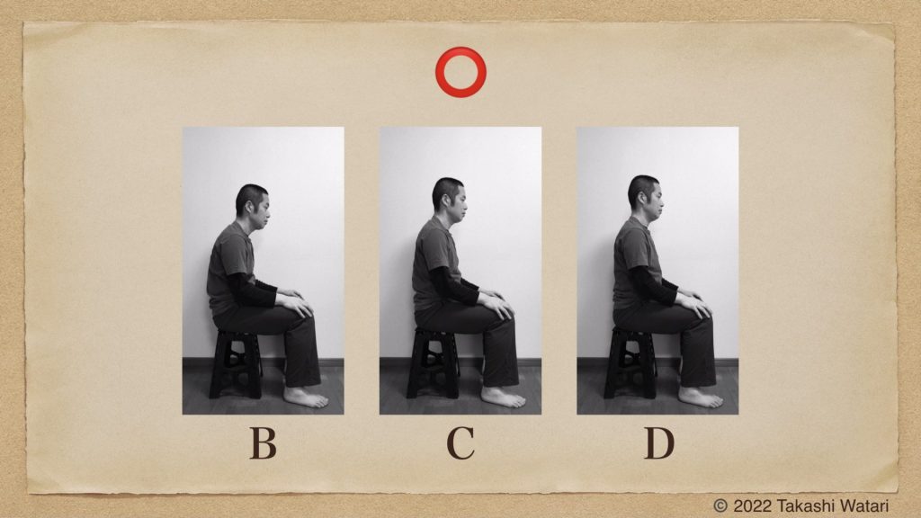 「姿勢を正す」という言葉があります。日常生活の中で聞かれる事も多いと思います。一般的に「姿勢を正す」際には、正面を見る事が多いです。正面を見る際にはCの姿勢が適しているでしょう。したがって私は、「姿勢を正す」際にはCの姿勢がとれれば十分である、と考えます。
