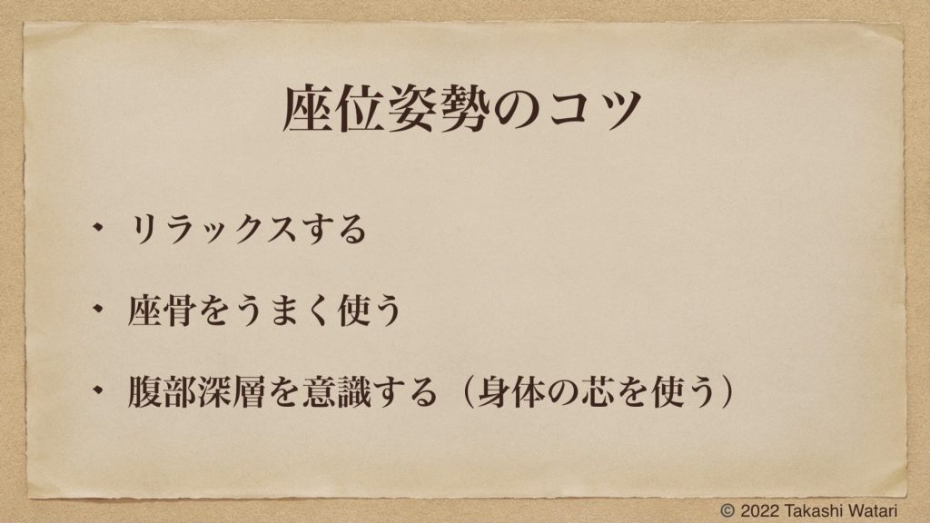リラックスして座骨にうまく荷重して座りましょう。姿勢のコントロールをする際は、腹部深層を含む身体の芯を使うといいでしょう。身体の芯を使って姿勢を正したり、猫背や伸び背になれる能力は、一生の財産になるはずです。
