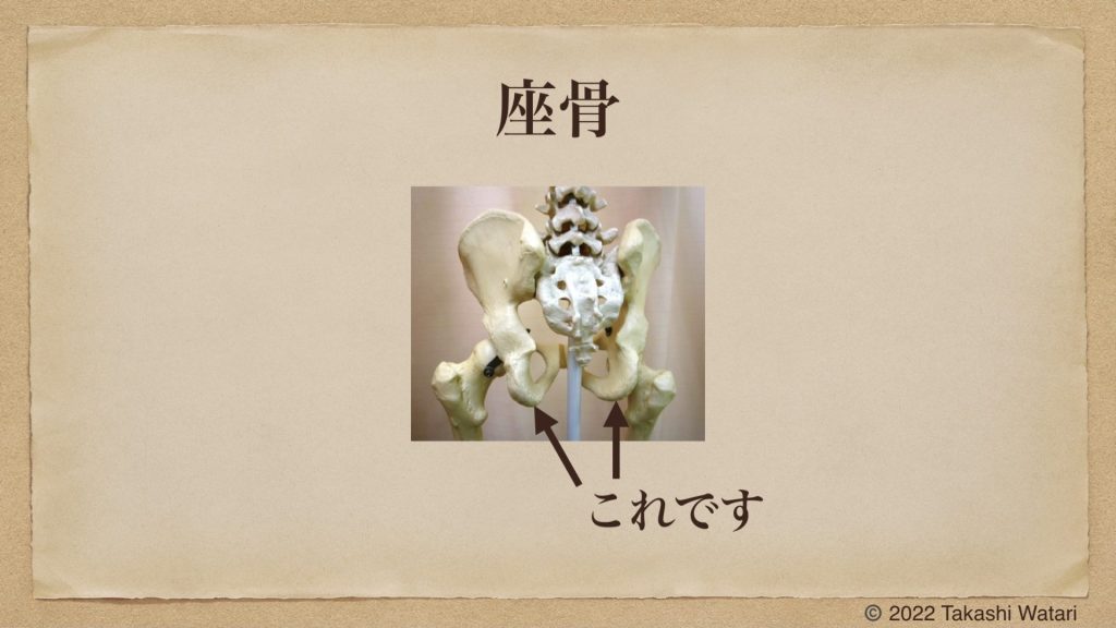 座骨は左右に1つずつあります。両方の座骨に荷重した座位姿勢もあれば、右や左の一方に荷重した座位姿勢もあるのです。例えば、デスクワークの中で正面のパソコンを使っている際には、両方の座骨にしっかり荷重した座位姿勢が望ましいでしょう。その一方で、右側にある電話が鳴った際には、右の座骨にうまく荷重できるといいでしょう。また、左側にいる誰かに話しかけられた際には、左の座骨にうまく荷重できるといいでしょう。