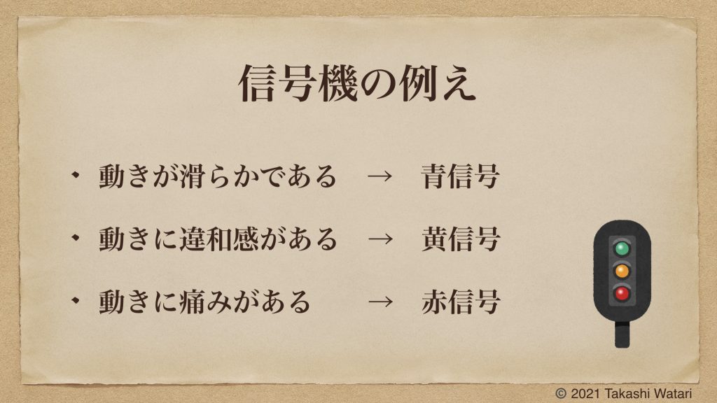 身体のどの辺りで物を持つべきでしょうか?人の身体には、滑らかに動かす事が可能な範囲もあれば、動きの中で痛みや違和感が生じる範囲もあります。信号機に例えるなら滑らかに動く範囲を青信号、違和感が生じる範囲を黄信号、痛みが生じる範囲を赤信号と言えるでしょう。身体を滑らかに動かす事が可能な範囲、別の言い方をすると、痛みや違和感なく身体を動かす事ができる範囲で物を持つべきであると私は思います。