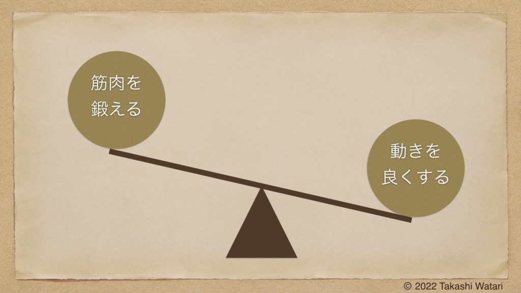 私が紹介するエクササイズは、筋肉を鍛える事を主たる目的とはしていません。身体の動きを良くする事が主たる目的です。しかし、身体の動きが向上すると、それに応じて必要な筋肉は自然と備わります。多くの場合はそれで十分でしょう。また、アスリート等でパワーの増大が必要な場合は、身体の動きを改善した上でトレーニングを行うと、より望ましい結果が得られるでしょう。