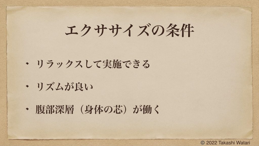 身体の動きを良くするためには、エクササイズの中で以下の条件が満たされている事が重要です。