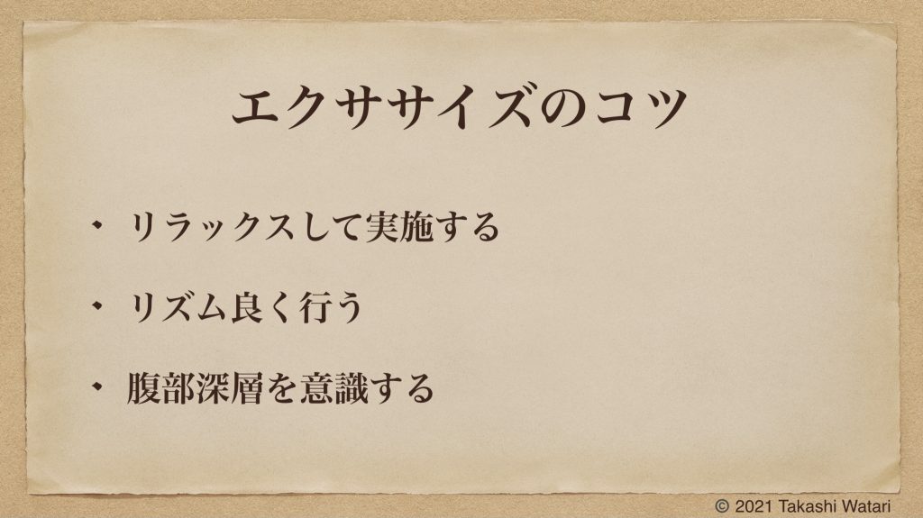 エクササイズを実施する際には、上記のコツのどちらか一方を意識しましょう。両方のコツを同時に意識する必要はありません。あえて分類すると、リラックスしてリズム良くエクササイズを行う事で、動きの滑らかさを向上する事が可能になります。そして、地に足をつけ身体の芯を意識しながらエクササイズをする事で、動きのエネルギー効率を向上する事が可能になります。