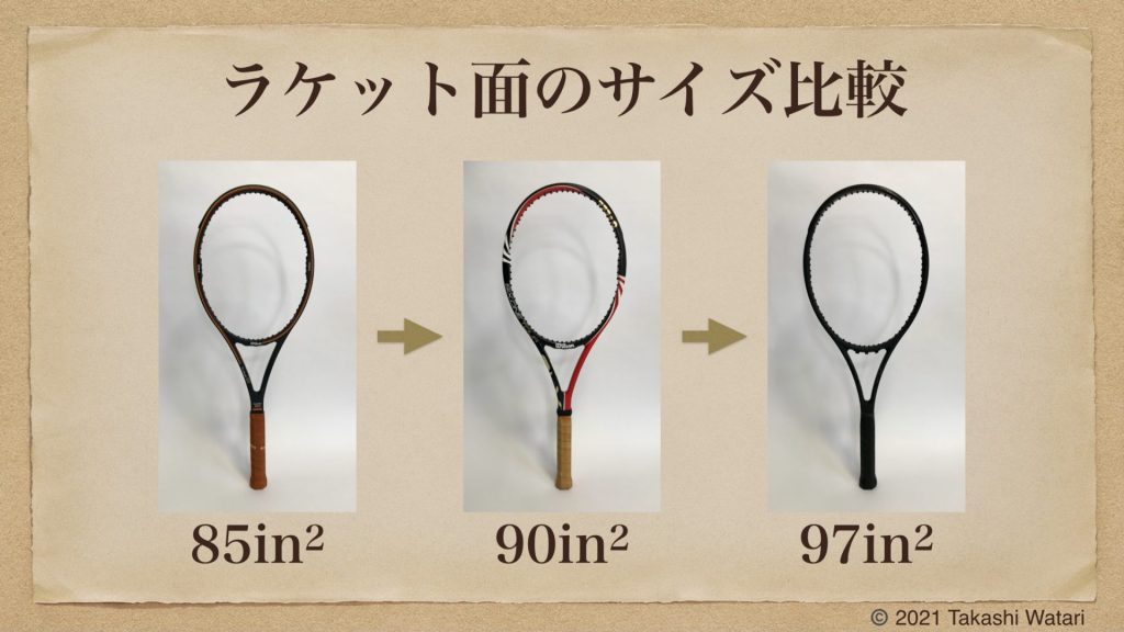 フェデラーは10年以上にわたり、90平方インチのラケットを使用しました。そして数多くの成功を収めました。しかしその後フェデラーは、ラケット面のサイズを97平方インチとさらに大きくし、現在にいたります。つまり、本日のブログの冒頭で紹介したラケットです。